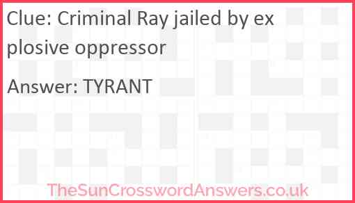 Criminal Ray jailed by explosive oppressor is a crossword clue for which we have 1 possible answer and we have spotted 2 times in our database. This crossword clue was last seen on 10 May 2023 in The Sun Cryptic Crossword puzzle!