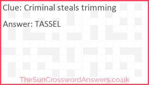 Criminal steals trimming is a crossword clue for which we have 1 possible answer and we have spotted 1 times in our database. This crossword clue was last seen on 11 December 2023 in The Sun Cryptic Crossword puzzle!