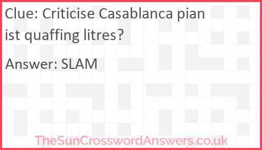 Criticise Casablanca pianist quaffing litres? is a crossword clue for which we have 1 possible answer and we have spotted 1 times in our database. This crossword clue was last seen on 25 August 2024 in The Sun Cryptic Crossword puzzle!