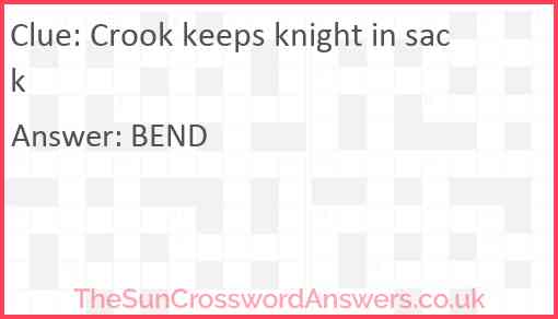 Crook keeps knight in sack is a crossword clue for which we have 1 possible answer and we have spotted 2 times in our database. This crossword clue was last seen on 04 September 2023 in The Sun Cryptic Crossword puzzle!