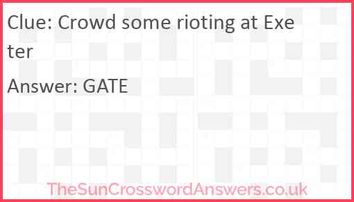 Crowd some rioting at Exeter is a crossword clue for which we have 1 possible answer and we have spotted 1 times in our database. This crossword clue was last seen on 13 September 2024 in The Sun Cryptic Crossword puzzle!