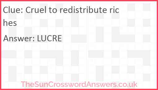 Cruel to redistribute riches is a crossword clue for which we have 1 possible answer and we have spotted 4 times in our database. This crossword clue was last seen on 30 April 2024 in The Sun Cryptic Crossword puzzle!