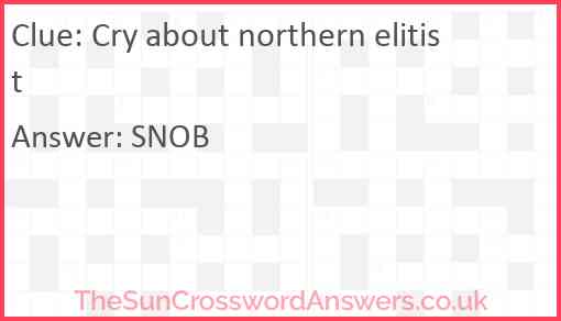 Cry about northern elitist is a crossword clue for which we have 1 possible answer and we have spotted 1 times in our database. This crossword clue was last seen on 23 June 2021 in The Sun Cryptic Crossword puzzle!