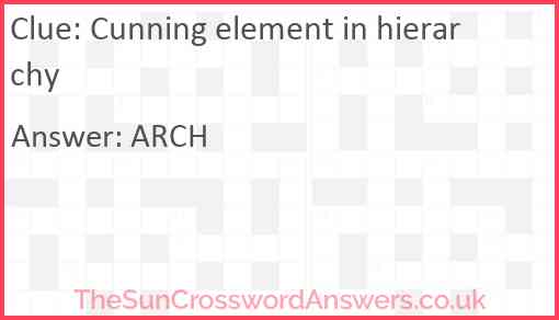 Cunning element in hierarchy is a crossword clue for which we have 1 possible answer and we have spotted 5 times in our database. This crossword clue was last seen on 25 April 2025 in The Sun Cryptic Crossword puzzle!