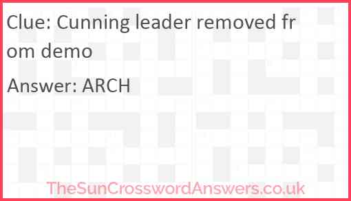 Cunning leader removed from demo is a crossword clue for which we have 1 possible answer and we have spotted 3 times in our database. This crossword clue was last seen on 06 March 2023 in The Sun Cryptic Crossword puzzle!