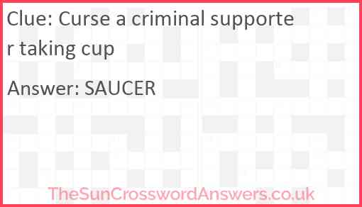 Curse a criminal supporter taking cup is a crossword clue for which we have 1 possible answer and we have spotted 2 times in our database. This crossword clue was last seen on 20 June 2024 in The Sun Cryptic Crossword puzzle!