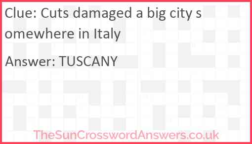 Cuts damaged a big city somewhere in Italy is a crossword clue for which we have 1 possible answer and we have spotted 1 times in our database. This crossword clue was last seen on 25 August 2022 in The Sun Cryptic Crossword puzzle!