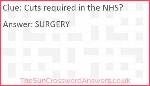Cuts required in the NHS? is a crossword clue for which we have 1 possible answer and we have spotted 2 times in our database. This crossword clue was last seen on 25 April 2024 in The Sun Cryptic Crossword puzzle!