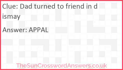 Dad turned to friend in dismay is a crossword clue for which we have 1 possible answer and we have spotted 1 times in our database. This crossword clue was last seen on 23 July 2023 in The Sun Cryptic Crossword puzzle!