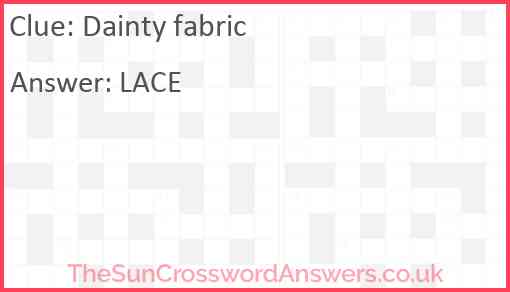 Dainty fabric is a crossword clue for which we have 1 possible answer and we have spotted 4 times in our database. This crossword clue was last seen on 07 September 2024 in The Sun Coffee Time Crossword puzzle!