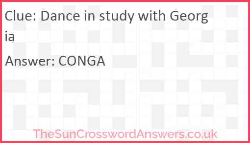 Dance in study with Georgia is a crossword clue for which we have 1 possible answer and we have spotted 2 times in our database. This crossword clue was last seen on 05 February 2025 in The Sun Cryptic Crossword puzzle!