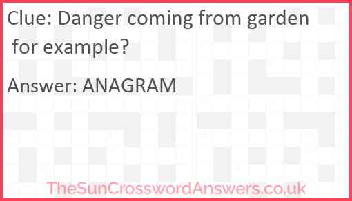 Danger coming from garden for example? is a crossword clue for which we have 1 possible answer and we have spotted 1 times in our database. This crossword clue was last seen on 17 February 2025 in The Sun Cryptic Crossword puzzle!