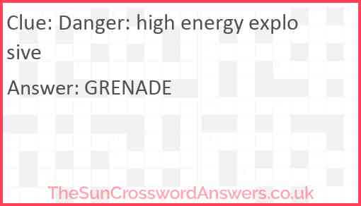 Danger: high energy explosive is a crossword clue for which we have 1 possible answer and we have spotted 2 times in our database. This crossword clue was last seen on 12 September 2024 in The Sun Cryptic Crossword puzzle!