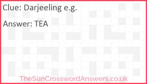 Darjeeling e.g. is a crossword clue for which we have 1 possible answer and we have spotted 4 times in our database. This crossword clue was last seen on 22 June 2025 in The Sun Coffee Time Crossword puzzle!