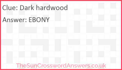 Dark hardwood is a crossword clue for which we have 1 possible answer and we have spotted 11 times in our database. This crossword clue was last seen on 23 January 2025 in The Sun Coffee Time Crossword puzzle!