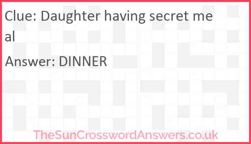 Daughter having secret meal is a crossword clue for which we have 1 possible answer and we have spotted 2 times in our database. This crossword clue was last seen on 27 September 2021 in The Sun Cryptic Crossword puzzle!