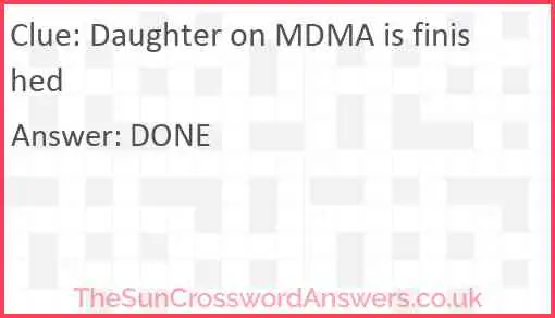 Daughter on MDMA is finished is a crossword clue for which we have 1 possible answer and we have spotted 1 times in our database. This crossword clue was last seen on 14 March 2025 in The Sun Cryptic Crossword puzzle!