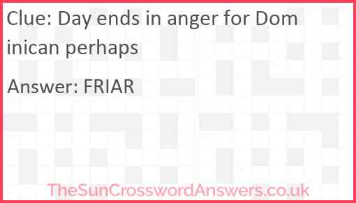 Day ends in anger for Dominican perhaps is a crossword clue for which we have 1 possible answer and we have spotted 1 times in our database. This crossword clue was last seen on 22 October 2022 in The Sun Cryptic Crossword puzzle!
