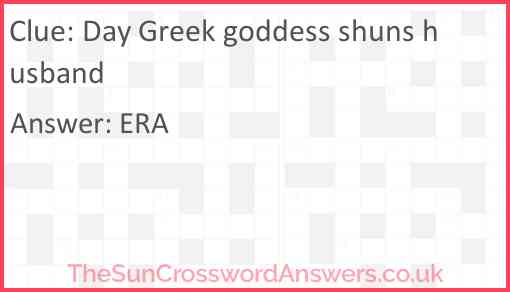 Day Greek goddess shuns husband is a crossword clue for which we have 1 possible answer and we have spotted 2 times in our database. This crossword clue was last seen on 12 April 2024 in The Sun Cryptic Crossword puzzle!
