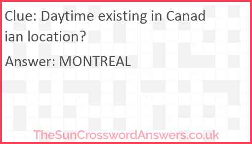 Daytime existing in Canadian location? is a crossword clue for which we have 1 possible answer and we have spotted 1 times in our database. This crossword clue was last seen on 25 August 2023 in The Sun Cryptic Crossword puzzle!
