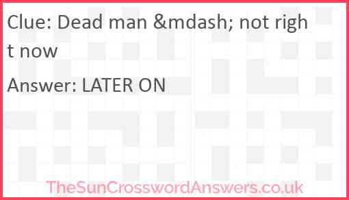 Dead man — not right now is a crossword clue for which we have 1 possible answer and we have spotted 1 times in our database. This crossword clue was last seen on 03 February 2020 in The Sun Cryptic Crossword puzzle!