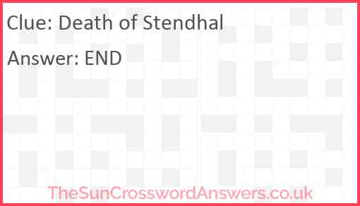 Death of Stendhal is a crossword clue for which we have 1 possible answer and we have spotted 1 times in our database. This crossword clue was last seen on 09 August 2024 in The Sun Cryptic Crossword puzzle!