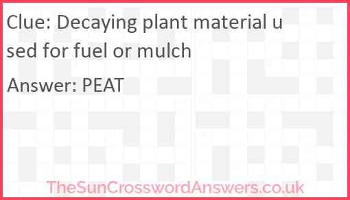 Decaying plant material used for fuel or mulch is a crossword clue for which we have 1 possible answer and we have spotted 1 times in our database. This crossword clue was last seen on 28 December 2018 in The Sun Coffee Time Crossword puzzle!