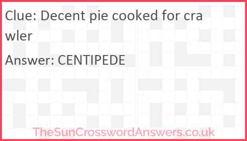 Decent pie cooked for crawler is a crossword clue for which we have 1 possible answer and we have spotted 1 times in our database. This crossword clue was last seen on 06 January 2024 in The Sun Cryptic Crossword puzzle!