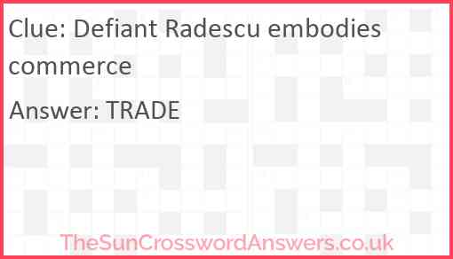 Defiant Radescu embodies commerce is a crossword clue for which we have 1 possible answer and we have spotted 1 times in our database. This crossword clue was last seen on 19 August 2021 in The Sun Cryptic Crossword puzzle!