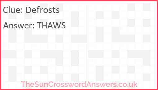 Defrosts is a crossword clue for which we have 1 possible answer and we have spotted 2 times in our database. This crossword clue was last seen on 18 June 2024 in The Sun Coffee Time Crossword puzzle!