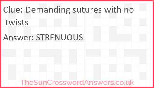 Demanding sutures with no twists is a crossword clue for which we have 1 possible answer and we have spotted 1 times in our database. This crossword clue was last seen on 28 March 2025 in The Sun Cryptic Crossword puzzle!