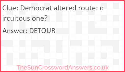 Democrat altered route: circuitous one? is a crossword clue for which we have 1 possible answer and we have spotted 1 times in our database. This crossword clue was last seen on 04 March 2021 in The Sun Cryptic Crossword puzzle!