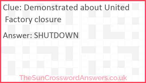 Demonstrated about United Factory closure is a crossword clue for which we have 1 possible answer and we have spotted 2 times in our database. This crossword clue was last seen on 19 August 2023 in The Sun Cryptic Crossword puzzle!