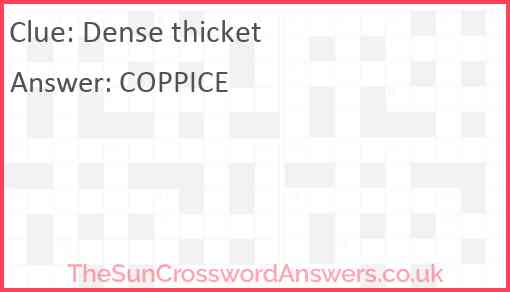 Dense thicket is a crossword clue for which we have 1 possible answer and we have spotted 1 times in our database. This crossword clue was last seen on 29 April 2024 in The Sun Coffee Time Crossword puzzle!