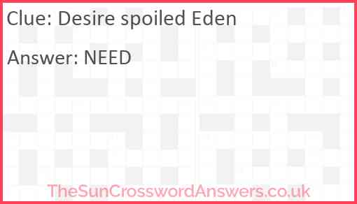 Desire spoiled Eden is a crossword clue for which we have 1 possible answer and we have spotted 4 times in our database. This crossword clue was last seen on 30 November 2024 in The Sun Cryptic Crossword puzzle!