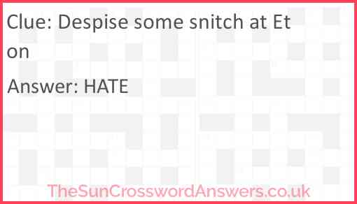 Despise some snitch at Eton is a crossword clue for which we have 1 possible answer and we have spotted 3 times in our database. This crossword clue was last seen on 06 June 2023 in The Sun Cryptic Crossword puzzle!