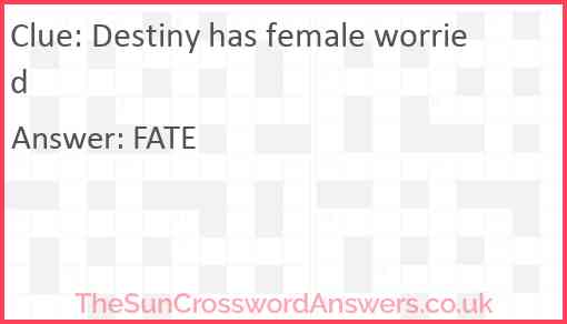 Destiny has female worried is a crossword clue for which we have 1 possible answer and we have spotted 1 times in our database. This crossword clue was last seen on 16 August 2024 in The Sun Cryptic Crossword puzzle!