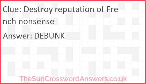 Destroy reputation of French nonsense is a crossword clue for which we have 1 possible answer and we have spotted 2 times in our database. This crossword clue was last seen on 08 February 2023 in The Sun Cryptic Crossword puzzle!