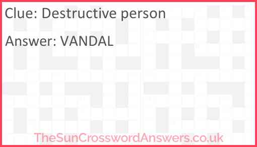 Destructive person is a crossword clue for which we have 1 possible answer and we have spotted 3 times in our database. This crossword clue was last seen on 02 March 2024 in The Sun Coffee Time Crossword puzzle!
