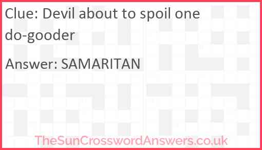 Devil about to spoil one do-gooder is a crossword clue for which we have 1 possible answer and we have spotted 2 times in our database. This crossword clue was last seen on 23 September 2023 in The Sun Cryptic Crossword puzzle!