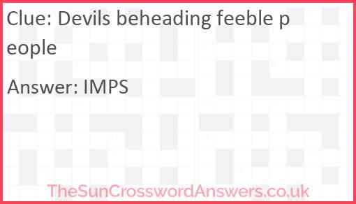 Devils beheading feeble people is a crossword clue for which we have 1 possible answer and we have spotted 3 times in our database. This crossword clue was last seen on 16 November 2022 in The Sun Cryptic Crossword puzzle!