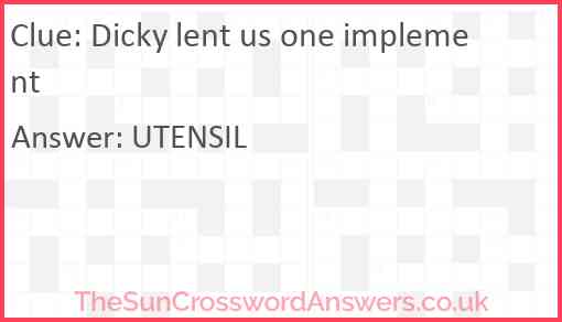 Dicky lent us one implement is a crossword clue for which we have 1 possible answer and we have spotted 1 times in our database. This crossword clue was last seen on 02 June 2024 in The Sun Cryptic Crossword puzzle!