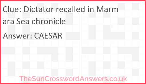 Dictator recalled in Marmara Sea chronicle is a crossword clue for which we have 1 possible answer and we have spotted 1 times in our database. This crossword clue was last seen on 03 September 2024 in The Sun Cryptic Crossword puzzle!