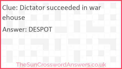 Dictator succeeded in warehouse is a crossword clue for which we have 1 possible answer and we have spotted 2 times in our database. This crossword clue was last seen on 06 August 2024 in The Sun Cryptic Crossword puzzle!