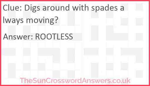 Digs around with spades always moving? is a crossword clue for which we have 1 possible answer and we have spotted 1 times in our database. This crossword clue was last seen on 22 December 2020 in The Sun Cryptic Crossword puzzle!