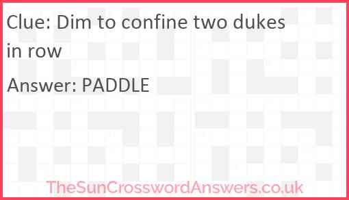 Dim to confine two dukes in row is a crossword clue for which we have 1 possible answer and we have spotted 2 times in our database. This crossword clue was last seen on 30 July 2024 in The Sun Cryptic Crossword puzzle!