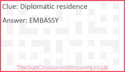 Diplomatic residence is a crossword clue for which we have 1 possible answer and we have spotted 1 times in our database. This crossword clue was last seen on 18 April 2019 in The Sun Coffee Time Crossword puzzle!