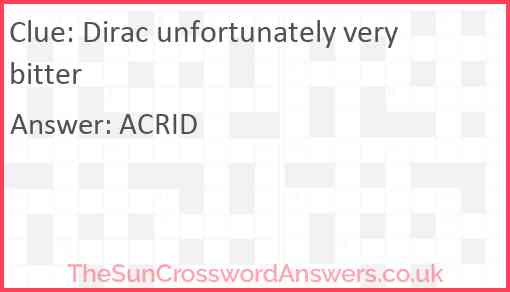 Dirac unfortunately very bitter is a crossword clue for which we have 1 possible answer and we have spotted 3 times in our database. This crossword clue was last seen on 24 January 2024 in The Sun Cryptic Crossword puzzle!