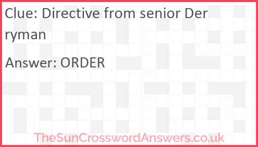 Directive from senior Derryman is a crossword clue for which we have 1 possible answer and we have spotted 2 times in our database. This crossword clue was last seen on 30 July 2024 in The Sun Cryptic Crossword puzzle!