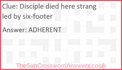 Disciple died here strangled by six-footer is a crossword clue for which we have 1 possible answer and we have spotted 2 times in our database. This crossword clue was last seen on 28 October 2023 in The Sun Cryptic Crossword puzzle!